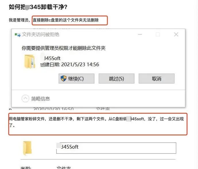 而更过分的是,很多流氓软件根本卸载不干净,附带的很多文件夹和小程序,哪怕开管理员权限都删不掉,只要重启,又会卷土重来。