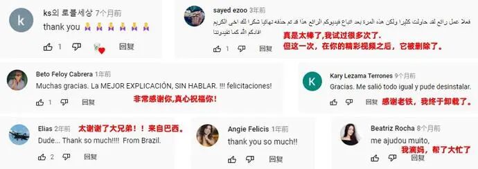 在这类视频评论区下方,各国人民齐聚一堂,他们虽然有着不同的语言,却有着同一个梦想——卸载360安全卫士。也因为按照视频步骤,成功卸载了360,他们脸上终于露出了久违的笑容。