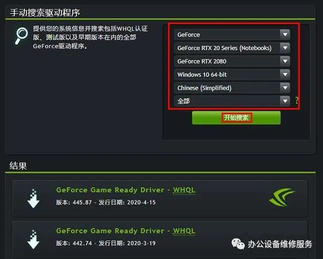 按照你的显卡芯片型号来进行选择,例如Nvidia GeForce RTX2080, 如果是笔记本就选择后缀带Notebooks的GeForce RTX20 Series(Notebooks),台式机的话GeForce RTX20 Series,显卡选择GeForce RTX2080,直接选择您的系统如果是win10 64位,就选择windows10 64bit,chinese为中文,点击开始搜索,结果就会出现不同版本的显卡驱动,最上面版本就是最新的显卡驱动,点击进去。