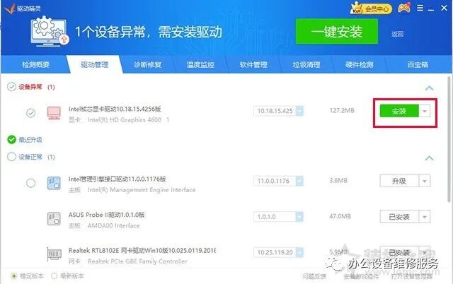 以驱动精灵安装驱动为例,在打开驱动精灵之后,这时驱动精灵会自动识别出没有安装驱动的显卡设备,我们点击安装按钮,即可安装显卡驱动。