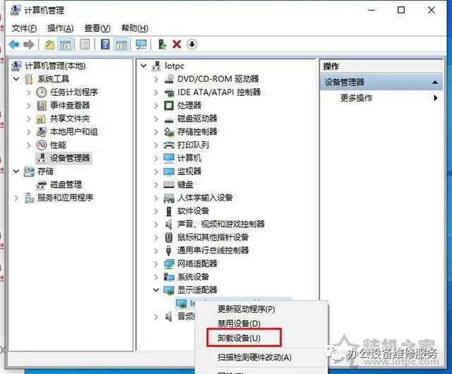 右键点击显卡设备选项上,选择卸载设备。如果有两个设备选项,说明一个是独立显卡,另一个是集成显卡,我们只需将独立显卡卸载就可以了,如果你是小白,不知道那个是独立显卡,全部卸载了。