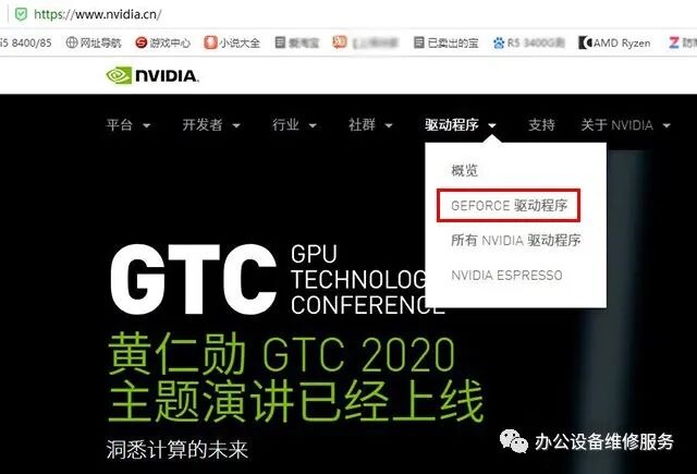 举个例子,假设我们的显卡是Nvidia GeForce RTX2080,说明是N卡,我们去Nvidia官方网站下载驱动,不知道Nvidia官方网站地址自行百度,到了NVIDIA官方网站之后,点击驱动程序,点击GeForce驱动程序,如下图所示。