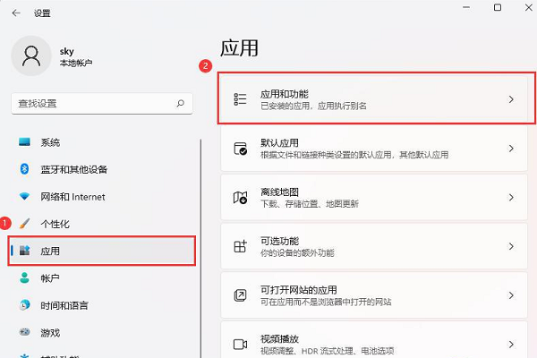 2.Windows设置窗口,左侧边栏,点击【应用】,右侧点击【应用和功能(已安装的应用,应用执行别名)】;