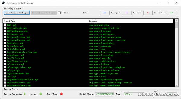Debloater软件需要在PC上安装,运行前请先打开手机的USB调试模式后再连接PC(USB调试模式在开发者选项中,开启方法是狂点设置中关于手机菜单中的系统版本),等连接成功后点击软件左上角的Read Device packages按钮即可获取手机中所有的APP程序。勾选你想要删除的APP,再点击Apply按钮就等同卸载了这些APP。