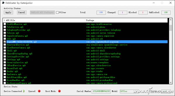 用Debloater软件删除的APP还可借助该软件恢复,方法是点击Read Device packages 获取设备上安装的应用列表后,找到删除的软件,去掉勾选再点击Apply按钮。
