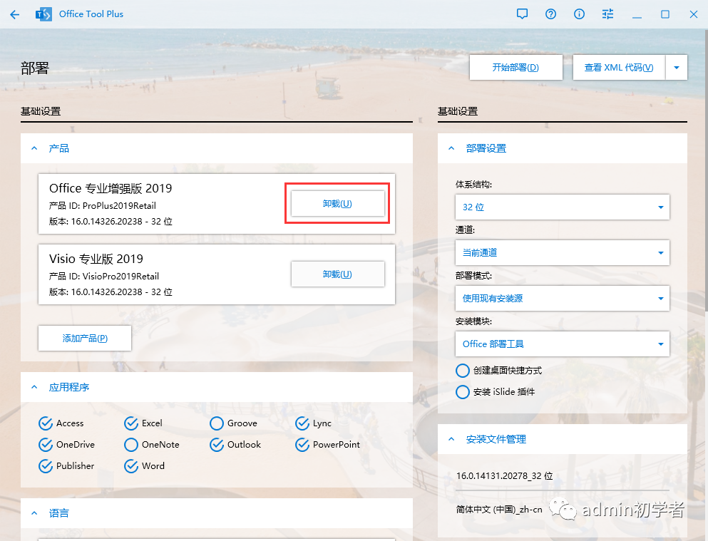 6.在部署界面,可以看到我们电脑上安装的office版本,在后面点击卸载,当下方显示点击[开始部署]以确认卸载的提示,点击右上角的开始部署。
