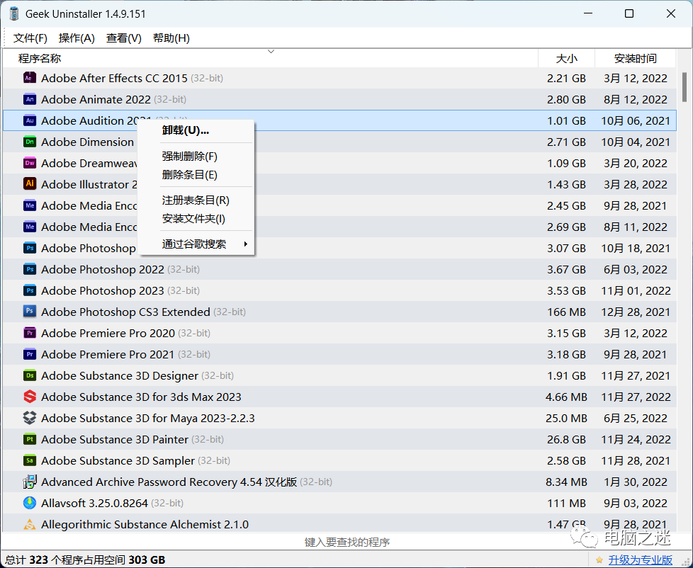 我今天给大家带来了一款非常好用的卸载软件,软件大小6M,但功能非常强大,无需安装,直接打开就会看到安装到电脑上的全部软件,软件还自带强制卸载功能,有些卸载不了的流氓软件也可以强制卸载掉,废话还是不多说,直接看效果吧!