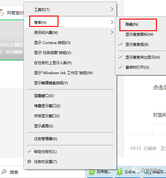 点击后 打开右边的设置选择隐藏 默认是:显示搜索框,这是Win10系统自动带的一个快捷方式