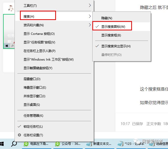 3、最后在弹出的子菜单中单击【显示搜索图标】或【隐藏】即可;