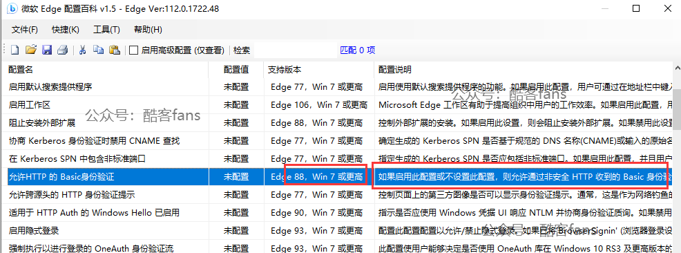 打开之后,你就可以看到 Edge 浏览器的各种可自定义配置项;并且,工具列出了每一个配置项兼容的浏览器版本和它们各自对应的功能。