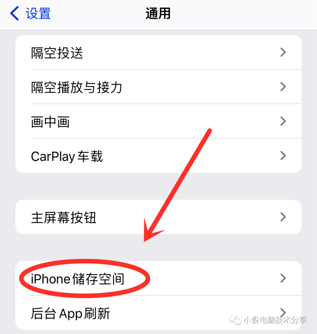 在通用里我们往下看,有一个iPhone储存空间,再点击进去。在这里面显示了这台手机所有的储存空间被占用的情况。