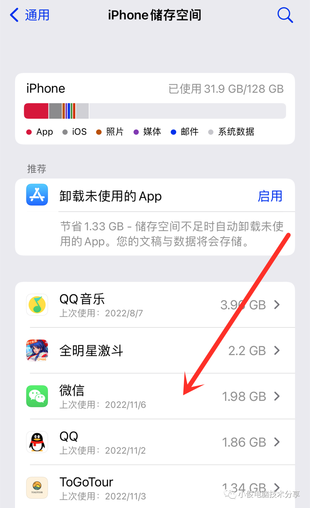 要实现彻底删除软件产生的数据,那么我们首先第一步就不能通过长按桌面图标卸载,我们需要进入到设置页面中的,苹果存储空间进行卸载
