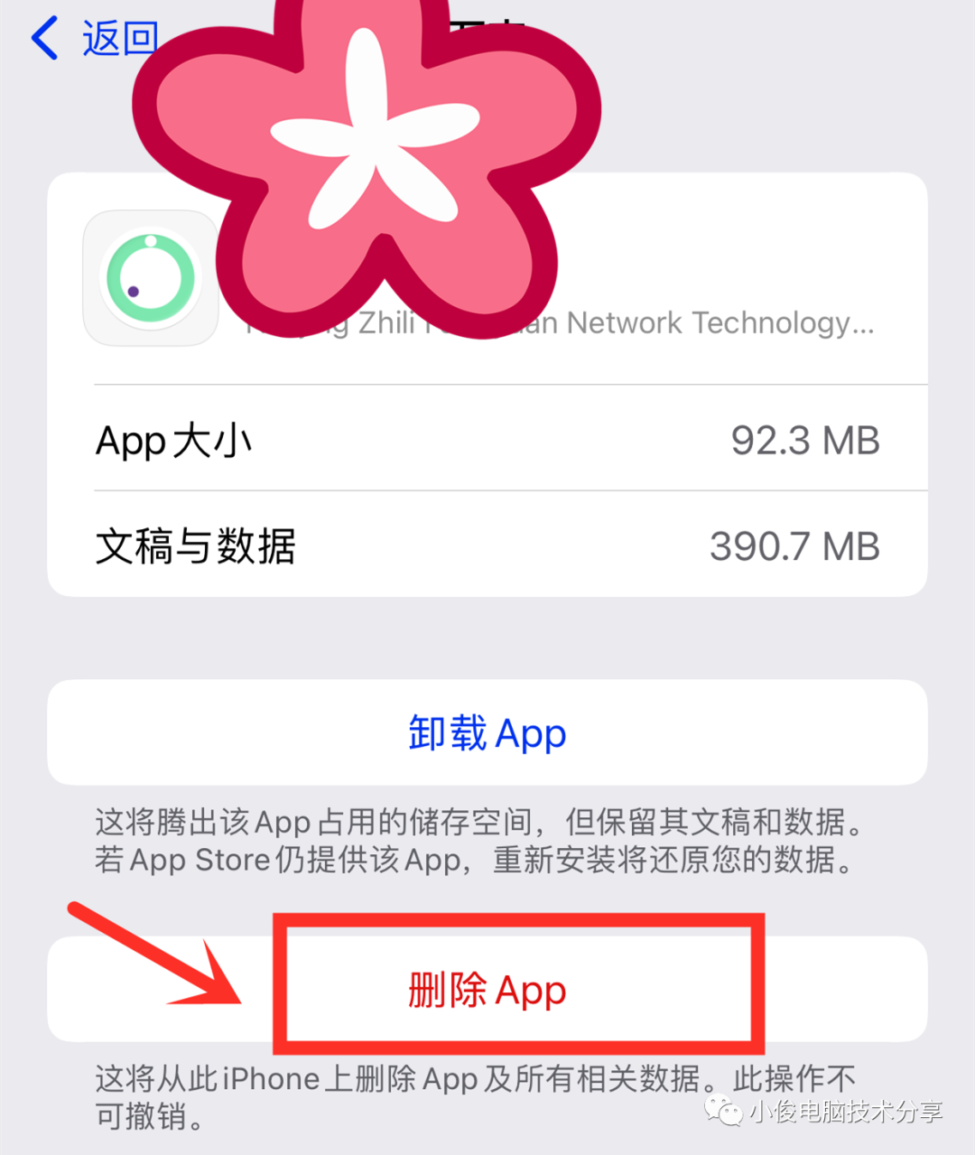 在这个页面我们往下拉,找到自己要卸载的应用。在这里我们就可以清楚地看到这个软件所占用的空间了,不仅如此,我们还能看到所产生的垃圾和文稿,因此啊,我们只有在这里才能把这些文稿也一并删除,此时我们点击【删除App】,而不是点击卸载【App】,这里大家需要注意一下,一定不要点错了!