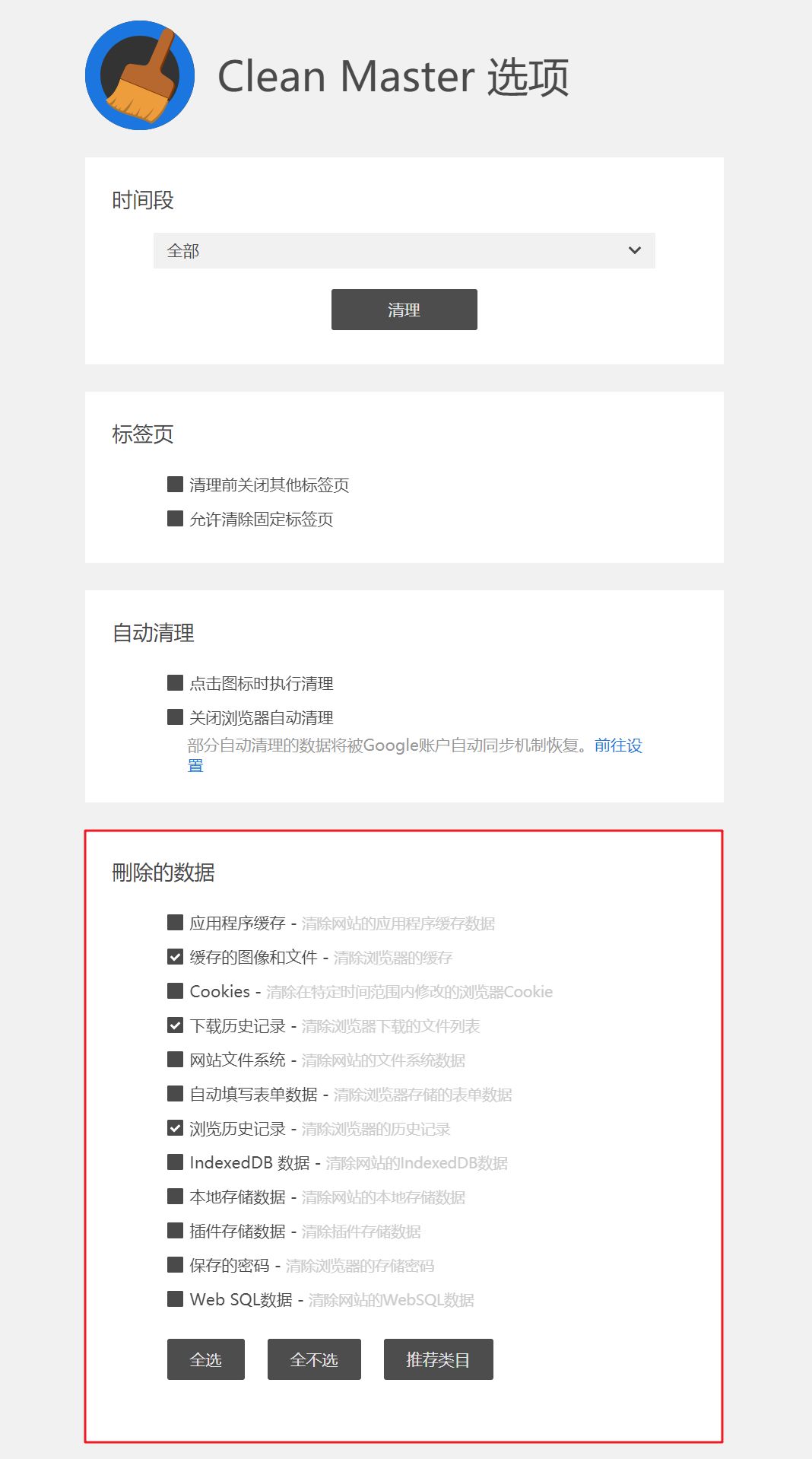 当然,我们可以像Chrome自带清理功能那样,选择需要清理的时间段。