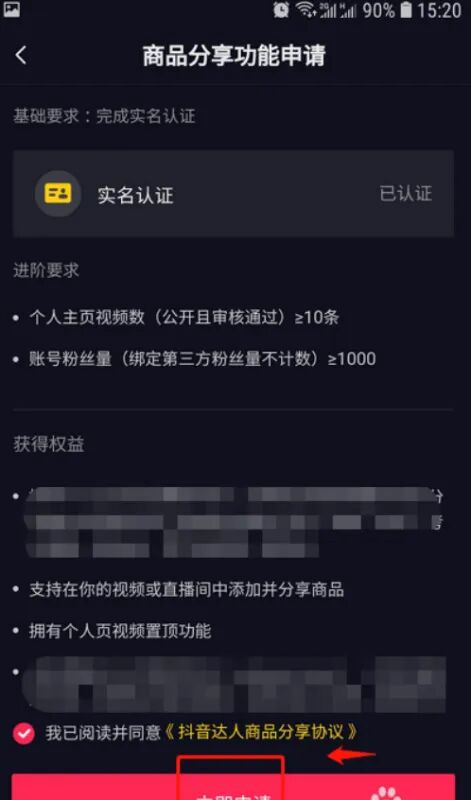 6、在商品分享功能申请页面,首先要完成实名认证,然后查看是否满足进阶要求,然后点击立即申请即可。