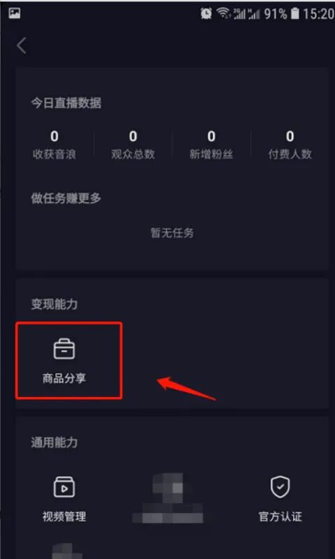 4、在创作者服务中心页面,点击变现能力中的商品分享,进入商品橱窗页面。