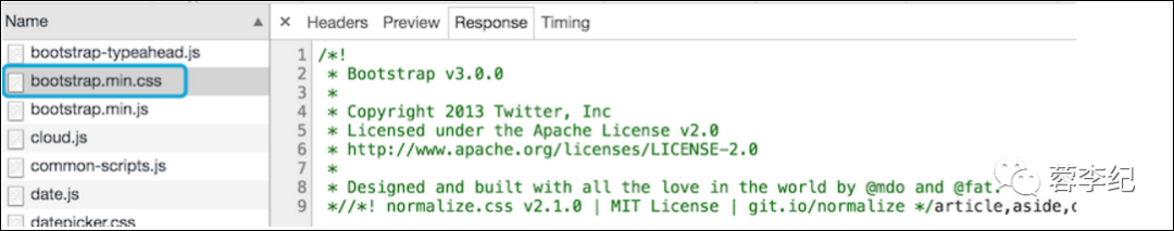 ③ 查看资源HTTP的Response信息 在Response标签里面可根据选择的资源类型(JSON、图片、文本、JS、CSS)显示相应资源的Response响应内容。下图显示的是当选择的资源是CSS格式时的响应内容。