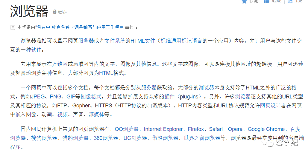 浏览器的主要功能就是向服务器发出请求,在浏览器窗口中展示您选择的网络资源。这里所说的资源一般是指 HTML 文档,也可以是 PDF、图片或其他的类型。资源的位置由用户使用 URI(统一资源标示符)指定。 浏览器解释并显示 HTML 文件的方式是在 HTML 和 CSS 规范中指定的。这些规范由网络标准化组织 W3C(万维网联盟)进行维护。多年以来,各浏览器都没有完全遵从这些规范,同时还在开发自己独有的扩展程序,这给网络开发人员带来了严重的兼容性问题。如今,大多数的浏览器都是或多或少地遵从规范。 简而言之,就是一个获取网页,并将它显示给用户的工具。