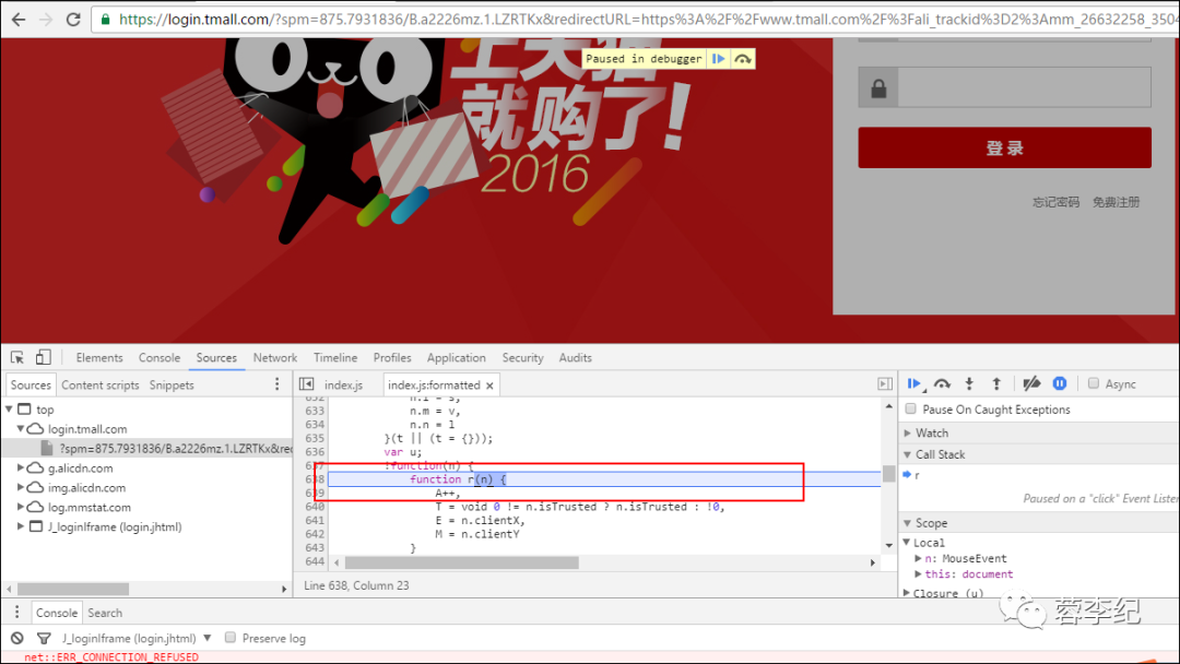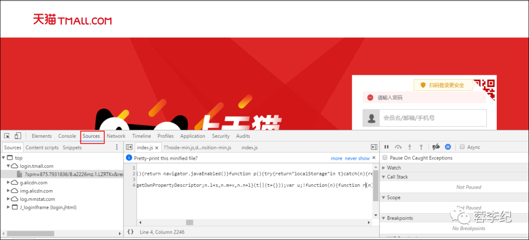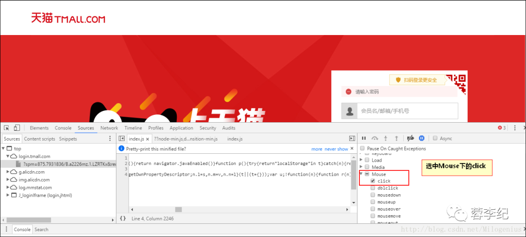 事件监听是对我们选定的是事件类型进行监听,当这个事件触发的时候,程序就会在这个事件处停止。有助于我们快速找到某一个元素上绑定的事件。应用场景:我们刚接手一个项目时,对业务不熟。想找到提交登录事件对应的方法,但是发现页面上登录按钮绑定事件写的不是很明确,而且处理登录业务的JavaScript脚本文件有几百行,想找到这个按钮很不容易。此时,我们就可以选定鼠标的点击事件进行监听,当我们点击登录按钮的时候控制台Sources面板会自动将我们带到登录方法处。事件监听断点使用步骤(以查找天猫首页登录方法为例):