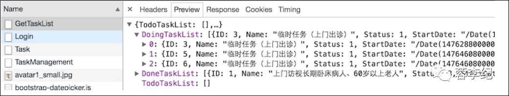 Name 资源名称,点击名称可以查看资源的详情情况,包括Headers、Preview、Response、Cookies、Timing。