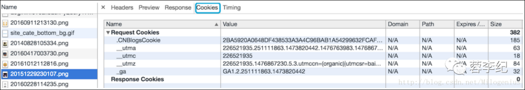 Cookies 显示资源HTTP的Request和Response过程中的Cookies信息。