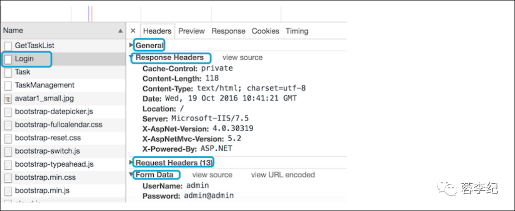Timing 显示资源在整个请求生命周期过程中各部分花费的时间。针对上面4个Tab进行详细讲解一下各个功能:① 查看资源HTTP头信息 在Headers标签里面可以看到HTTP Request URL、HTTP Method、Status Code、Remote Address等基本信息和详细的Response Headers 、Request Headers以及Query String Parameters或者Form Data等信息。