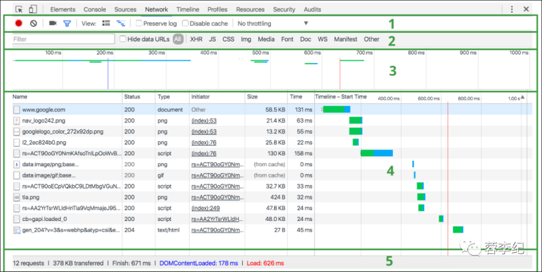 1.Controls控制Network的外观和功能。2.Filters控制Requests Table具体显示哪些内容。3.Overview显示获取到资源的时间轴信息。4.Requests Table按资源获取的前后顺序显示所有获取到的资源信息,点击资源名可以查看该资源的详细信息。5.Summary显示总的请求数、数据传输量、加载时间信息。