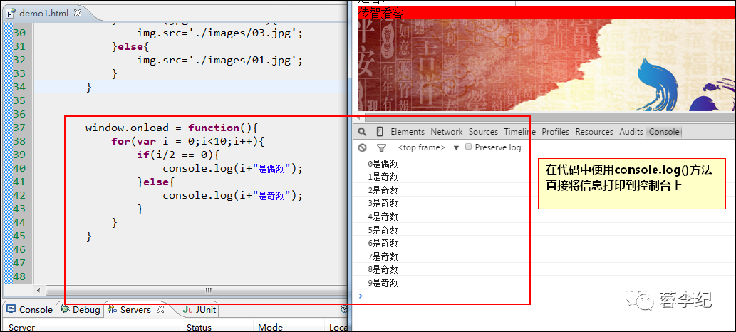 上边说到了简单的调试可以使用alert方法将想要看到的信息显示在弹窗中。但是alert存在弊端:阻断程序运行,不能显示对象的细节信息,弹出多个信息时必须点击确定才能看到下一个弹窗的信息。这些问题使用console提供的打印日志的方法可以完美解决。Console常用的打印日志的方法有:A)console.log(info)显示一般的基本日志信息,当要显示的基本日志信息太多时,可以使用console.grop()方法将日志分组; B)Console.warn(info)显示带有黄色小图标的警告信息; C)Console.error(info)显示带有红色小图标的错误信息;Console打印日志的使用场景:A)在代码中使用console.log()打印日志信息: