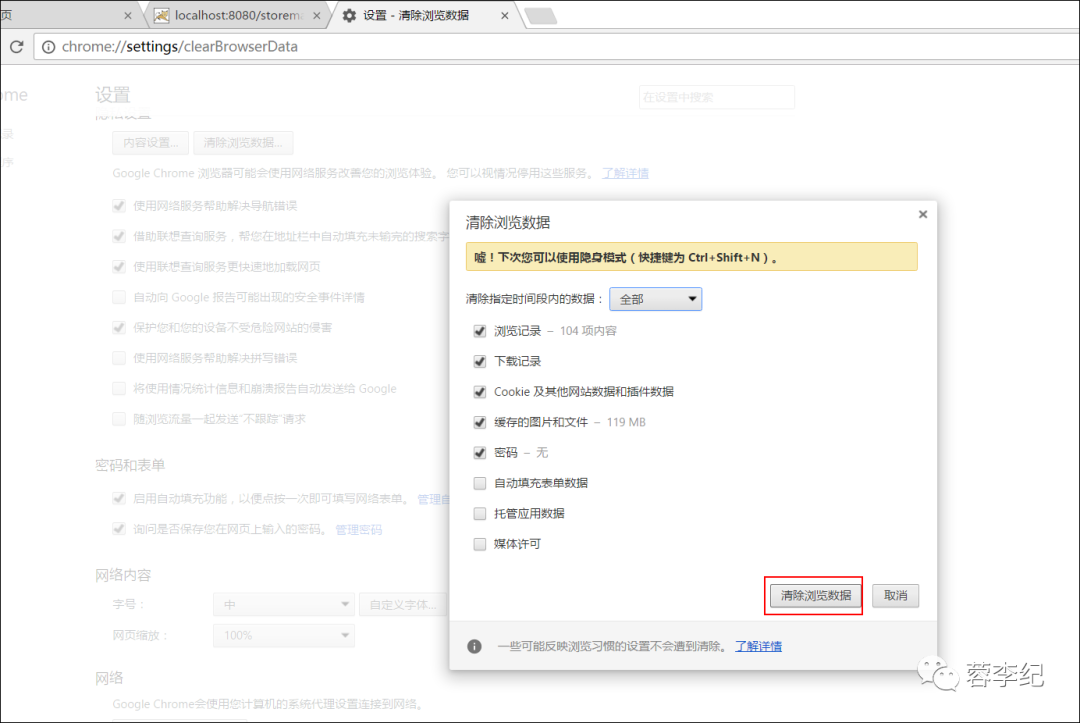 按快捷键:Ctrl + Shit + Del 会弹出一个清除浏览数据的弹窗,选择要清理的数据项之后,点击清除浏览数据即可。