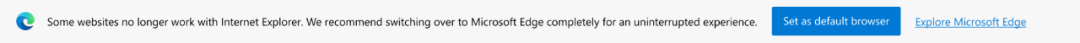 当然,用户也可以选择停留在 IE 浏览器内。不过,不兼容页面的地址栏下将会出现如下图所示的提醒横幅:提示用户切换到 Edge 浏览器。