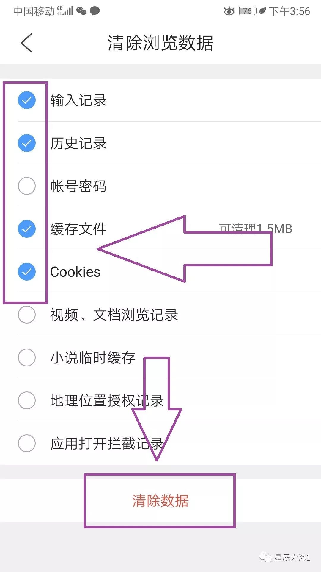 4、先【缓存文件】【Cookies】一定要都打上√,再点【清除数据】,然后退出重新登陆就可恢复正常使用。