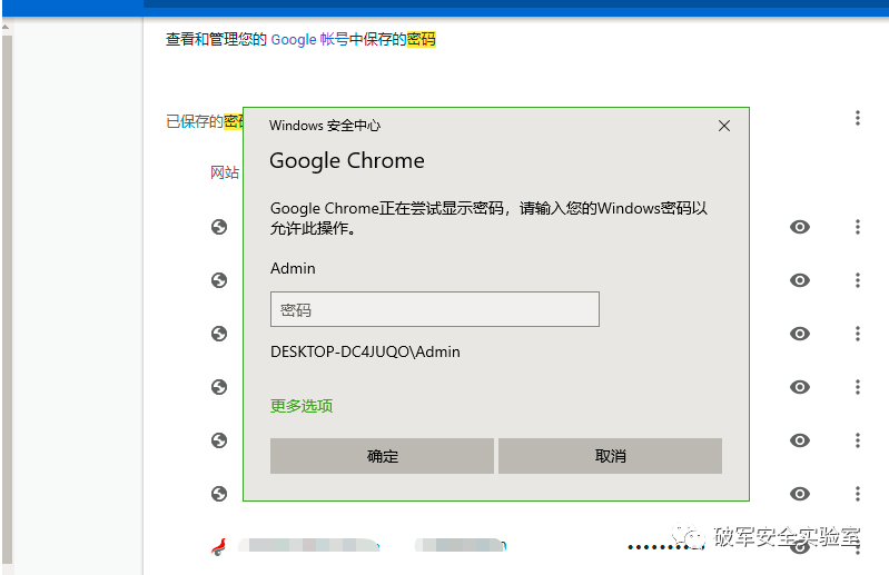 这个时候我们点击眼睛显示密码,发现要输入WINDOWS用户登录密码,说明只要知道这台电脑的用户开屏密码,就能获得所有你在浏览器上保存的账号密码。
