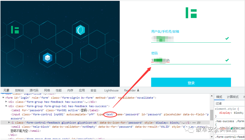 坏人可以到你保留过密码的网站进行登录,如果想知道你的密码,只需要按F12打开开发者工具,点击元素,再定位input里的type属性的password修改为text,那么密码就将会在登录页面明文显示。如下图: