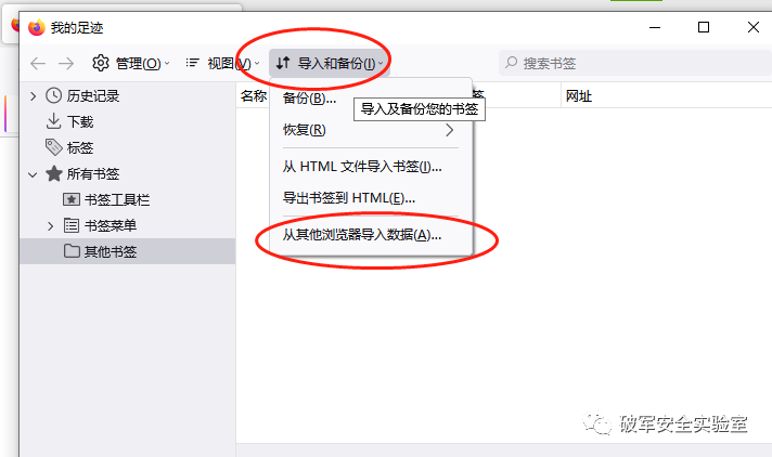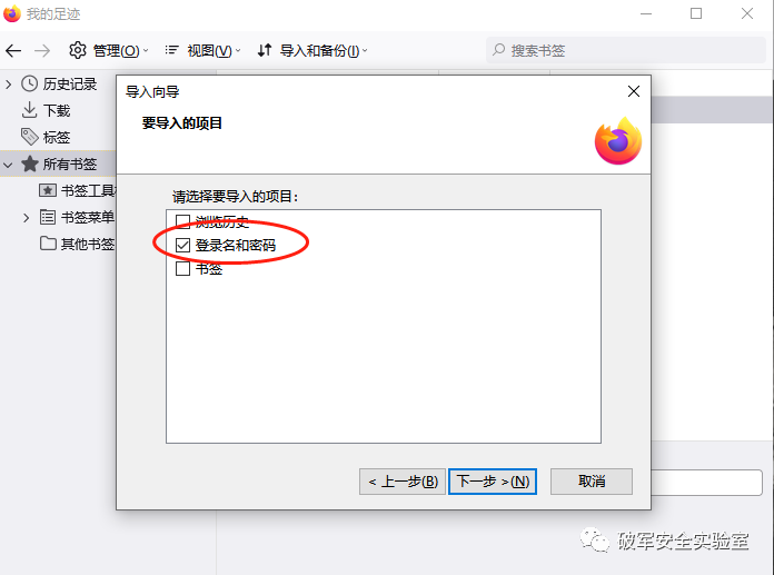 之后我们可以通过AnalysisChromeLogin.exe进行解密。也可以用以下方法,用火狐浏览器导入谷歌浏览器的密码进行查看。书签>>管理书签>>导入和备份>>从其他浏览器导入数据>>登录名和密码。