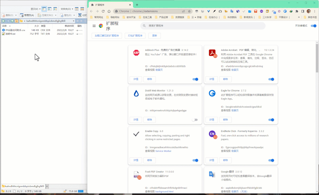然后打开开发者模式,直接把扩展插件拖入即可: