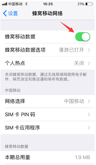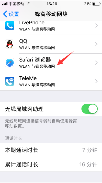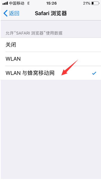 2、或者是看看是否禁用了Safari浏览器的网络,这种情况一般估计许多人都发生过,如果不小心禁用了Safari浏览器的网络,那么就会导致网页无法打开,解决方法:进入蜂窝移动网络里面,找到【Safari浏览器】,如果看到蜂窝移动网络连接显示【关闭】,勾选WLAN与蜂窝移动网将已关闭的网络连接【启用】即可。(如:图)