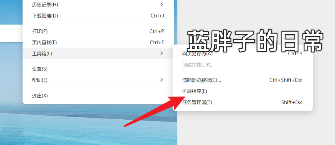 直接看它的右上角,有一个很熟悉的扩展程序按钮,没有的话点击最右侧的按钮也能找到。