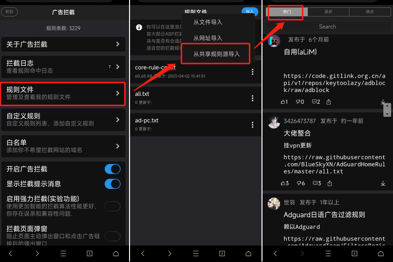 进入广告拦截页面,选择规则文件,然后点击右上角三个点设置按钮,选择从共享规则源导入,就可以看到好多使用的规则。如果有懂规则的编写的也可以自定义规则,肯定爽到起飞~还有用户脚本选项,里面同样丰富!