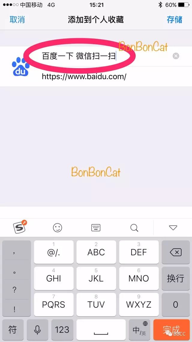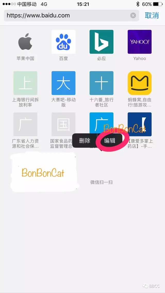 4.保存后,你只要点一下Safari上面的网址栏,就会出现收藏夹,现在长按刚才新建的微信扫一扫,并选择编辑。