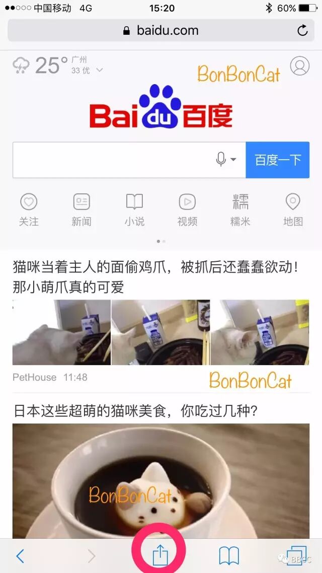 1.首先用Safari随便打开一个页面,我们这里打开百度来做例子。打开后点击下方的功能键。