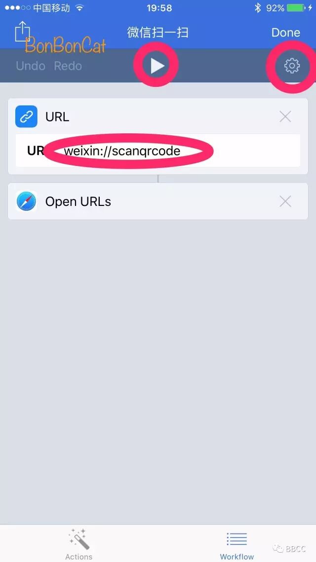 5.在流程的URL中输入weixin://scanqrcode。现在,你可以按上面的三角形来测试能否打开微信的扫一扫功能。然后点击右上角的设置按钮。