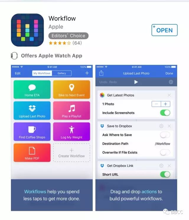 高级篇里面,我们需要用到一个工具大名鼎鼎的app——workflow,现在已被苹果收购了,可以免费下载使用。