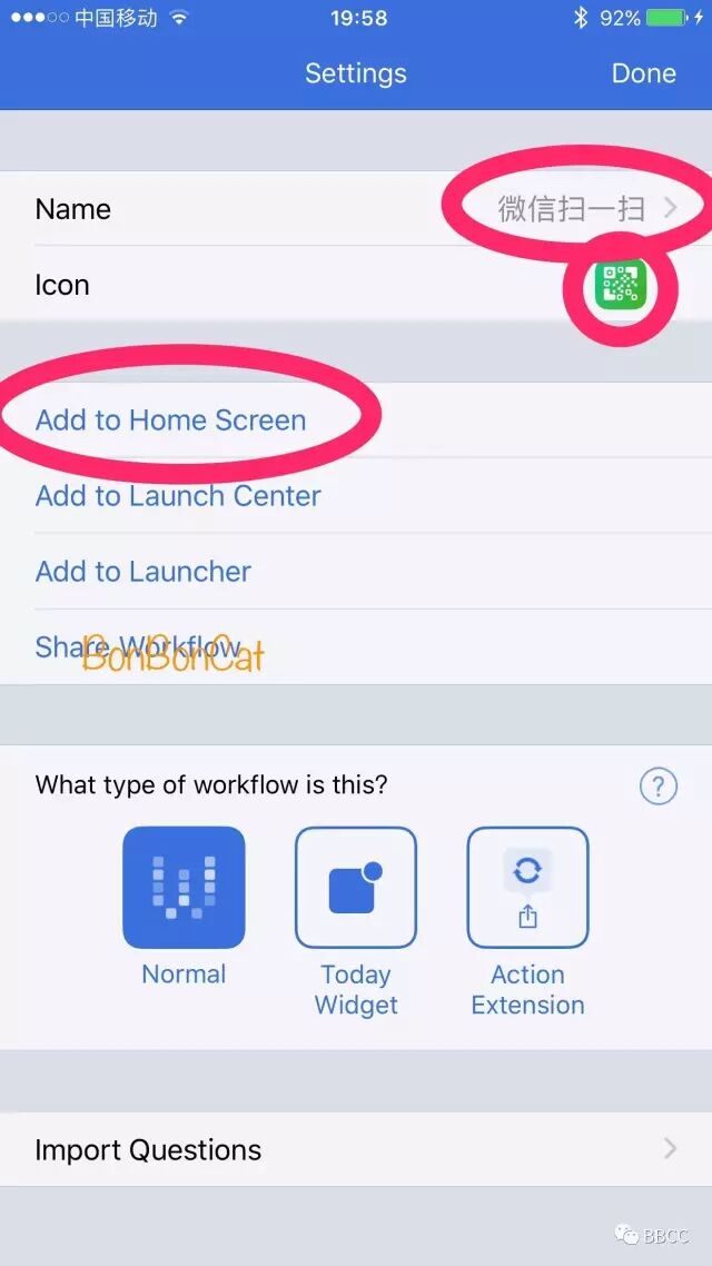 6.进入设置页面,我们先把名字Name修改一下,再选择一个喜欢图标Icon。最后点击Add to Home Screen,就是把这个流程加到主屏幕桌面(这里会有操作方式的提示)。