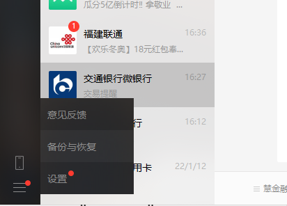 首先将电脑A和电脑连接在同一个局域网,接着在电脑上启动Windows微信,使用手机A的微信账号登录后点击左下角的设置→备份和恢复。