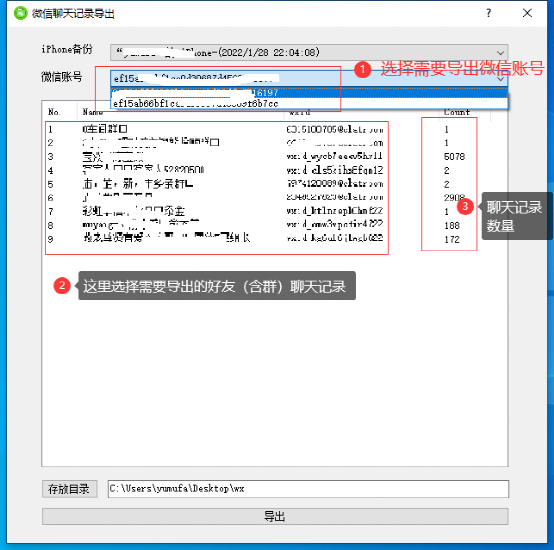 在上述操作中选中备份文件夹后软件会自动读取其中保存的微信记录,先点击最下方的设置保存目录,然后为导出的记录选择保存位置。继续在下方的微信账号列表选中需要导出记录的微信账号(如果手机登录过多个微信账号,可以自由选择导出账号),在中间的框选列表,No.表示的该账号下好友(含群)数量,后面的count表示的是和该好友(或者群)中的聊天记录的数量,最后点击导出按钮。