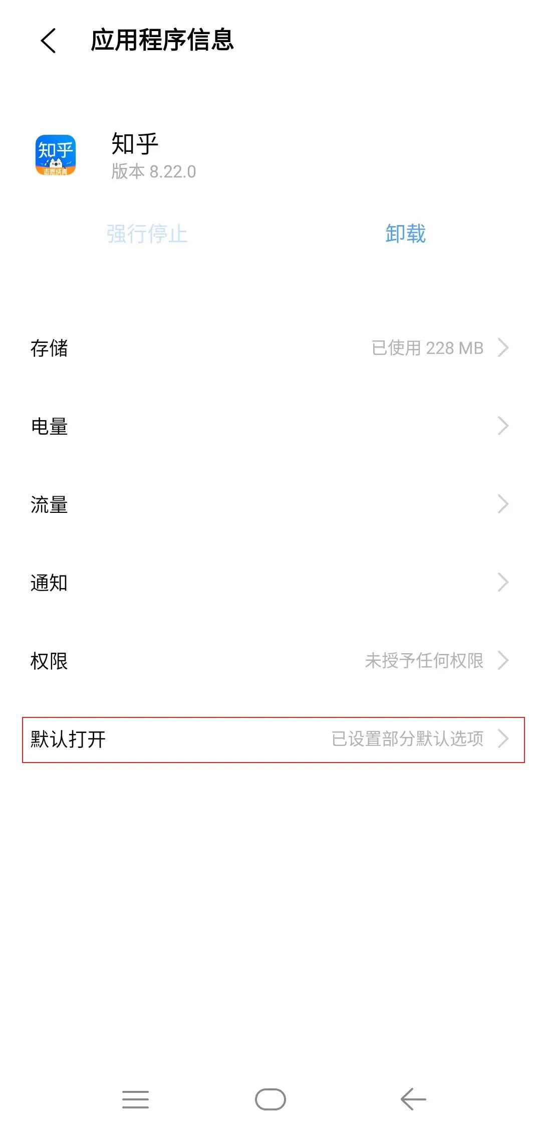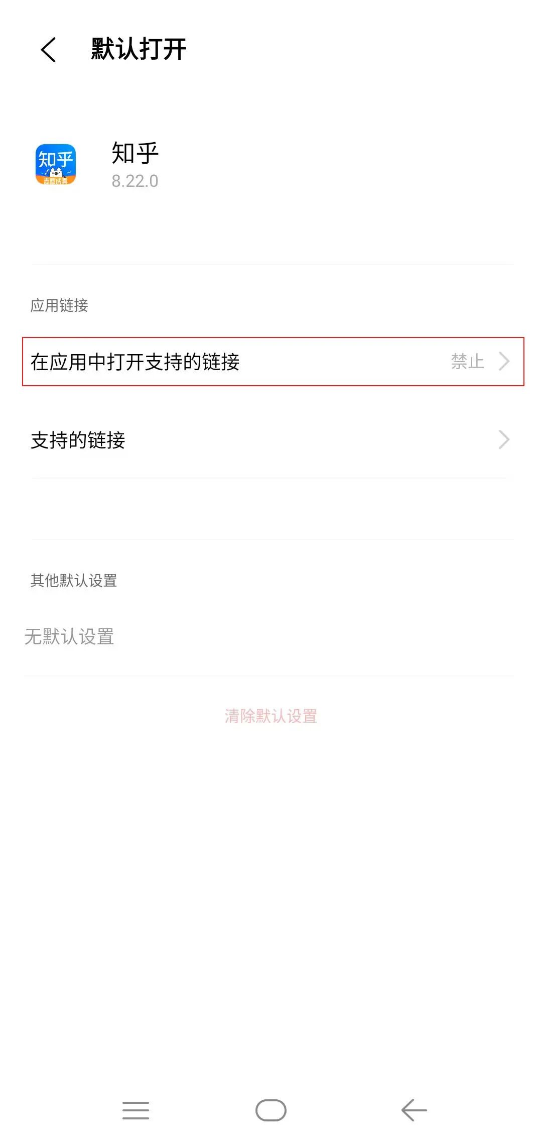 打开手机【设置】---->【应用与权限】----->【应用管理】---->选择应用如【知乎】---->【默认打开】---->【在应用中打开支持的链接】---->选择【禁止】。