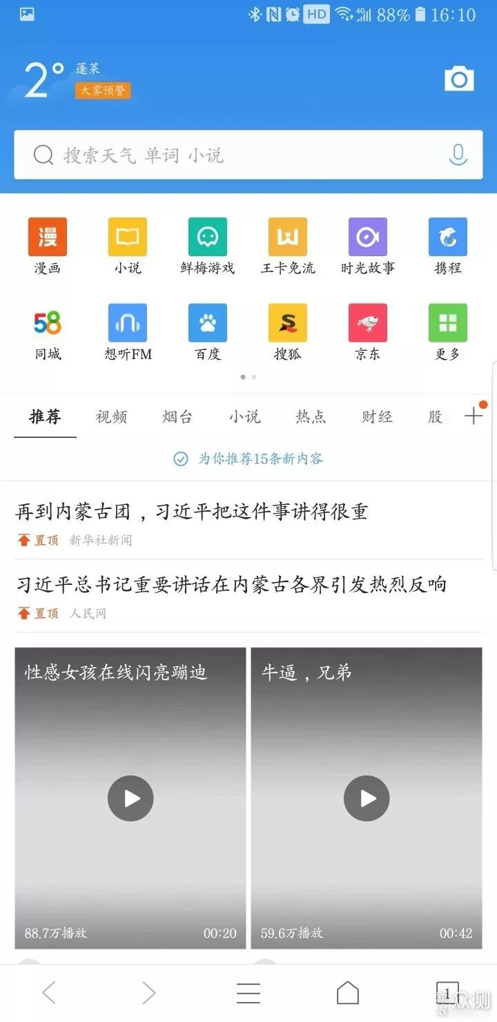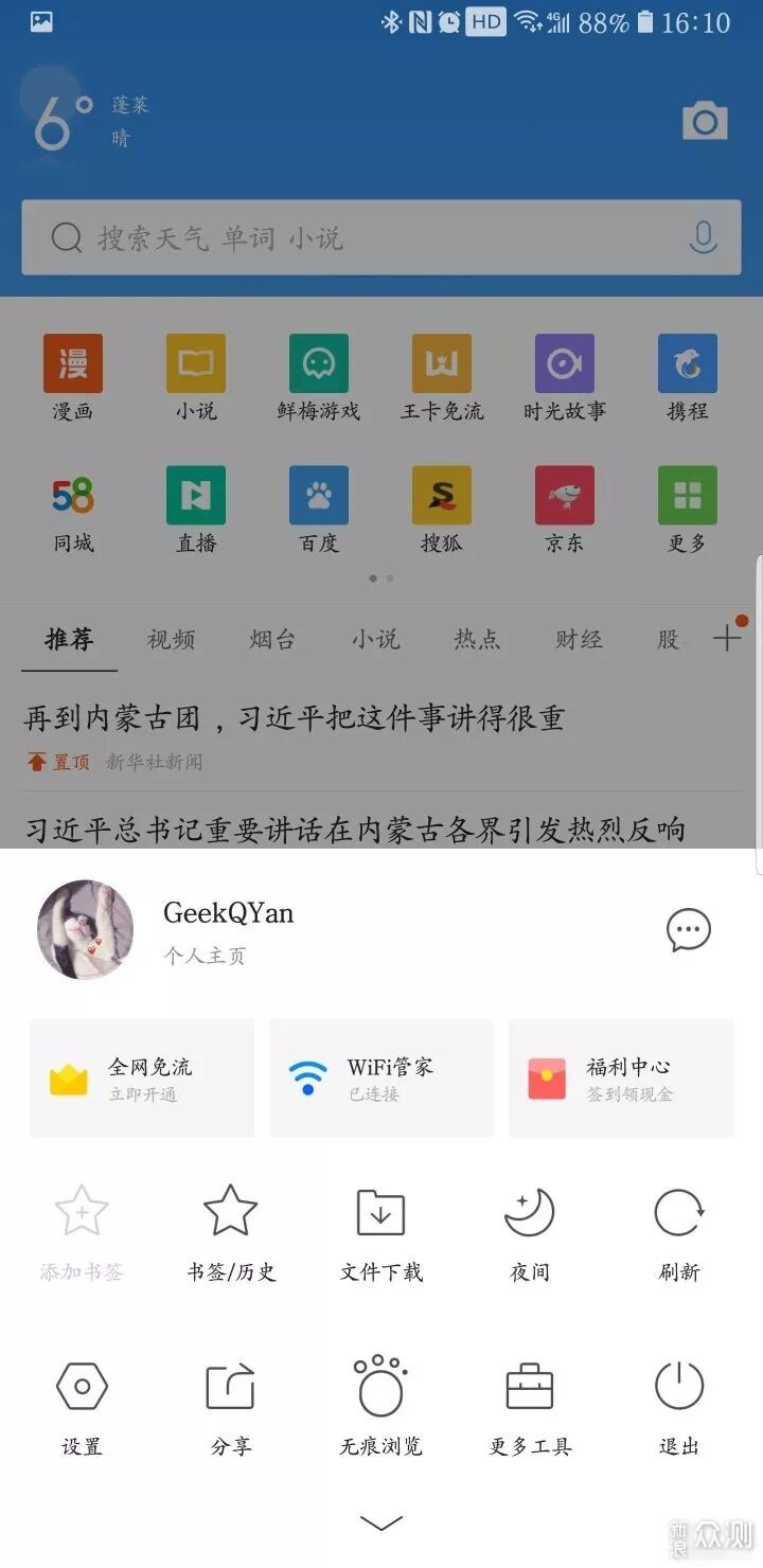 ▲功能特别丰富,像头条资讯啊、海量视频、游戏交友、小说、智能搜索、夜间模式、还集合了网盘功能。