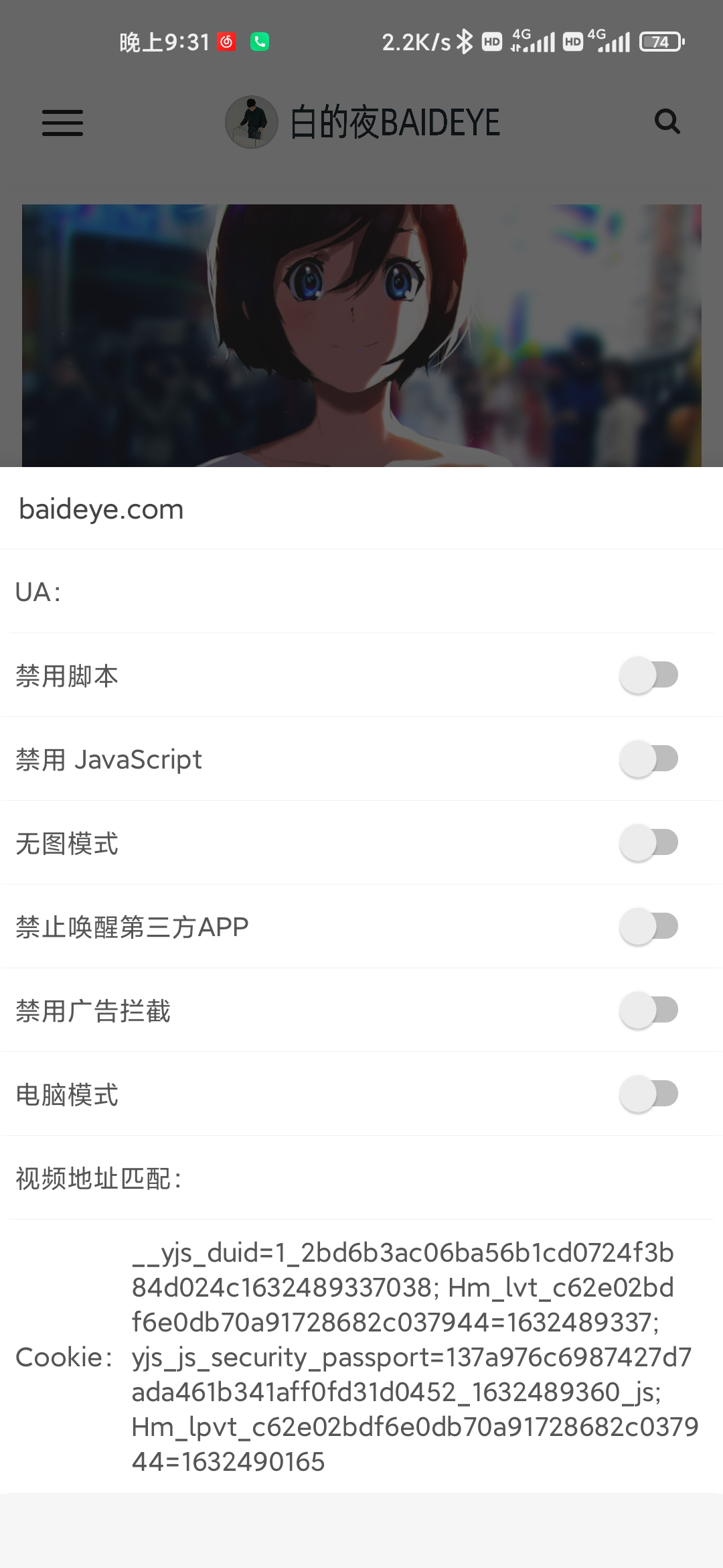 点开某个网页,你可以设置该网站禁用脚本、JavaScript、禁止唤醒第三方APP,以及显示当前Cookie,这个Cookie也是电脑上长用的一个,手机上很少有浏览器可以显示出Cookie。