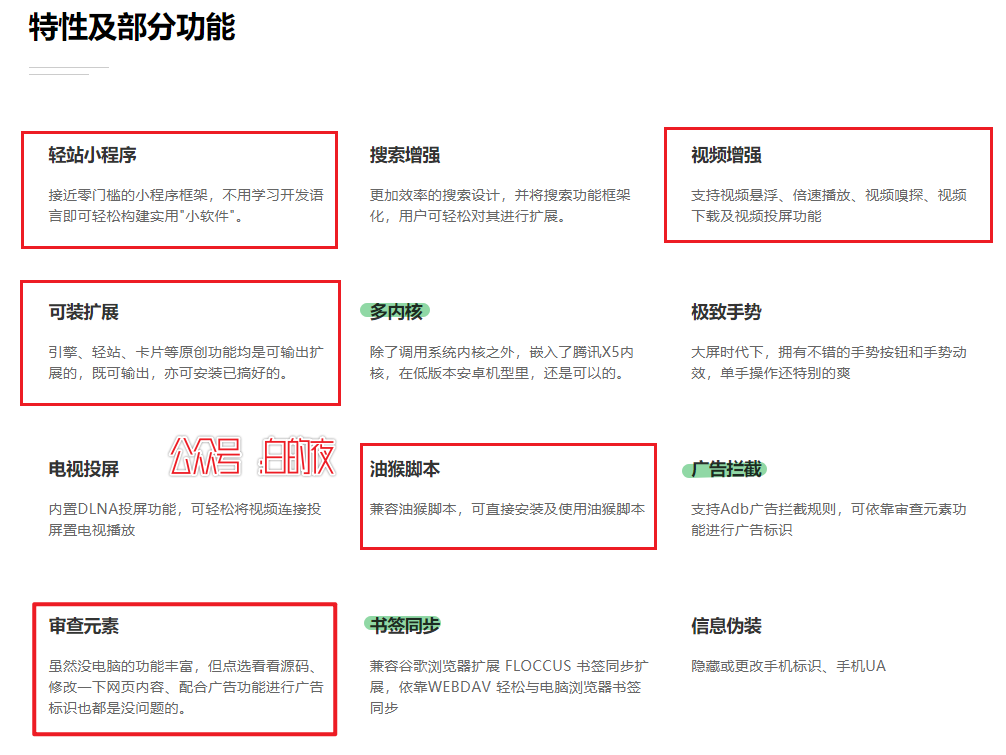 开发者自己说了12个特色功能,我认为比较重要的是5个,红色方框标注;次重要的3个,用绿色马克笔标注;剩下的几个功能属于有了更好,不作介绍了。