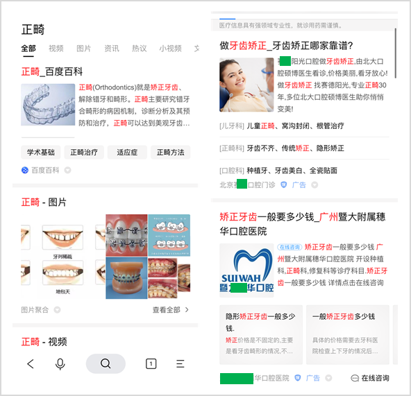 我们搜索关键词正畸,下图左图是简单搜索的截图,右图则是Alook的截图,明显能感受到对比。